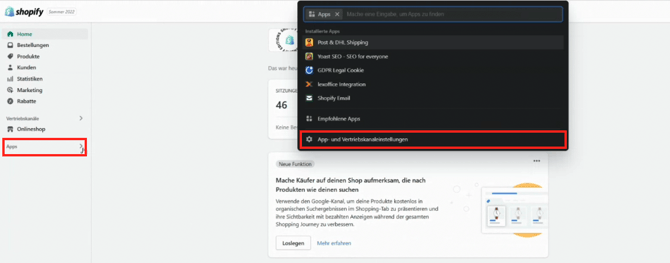 Schritt 3: Melden Sie sich bei Ihrem Shopify an und klicken Sie auf "Apps" ganz links auf dem Bildschirm, klicken Sie anschließend auf "App- und Vertriebskanaleinstellungen".