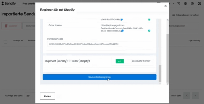 Schritt 21: Klicken Sie nun bei Sendify auf "Save & start integration"